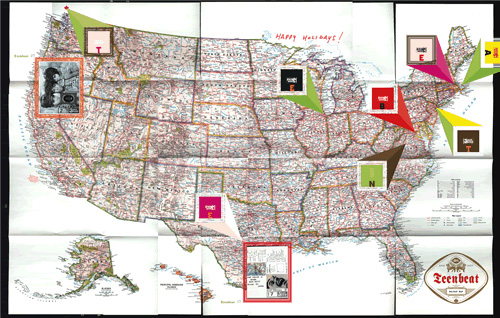 A photographic fold-out holiday map sent to friends and allies. Pictures the Teen-Beat office staff, and locates Teen-Beat recording artists on a map of North America.