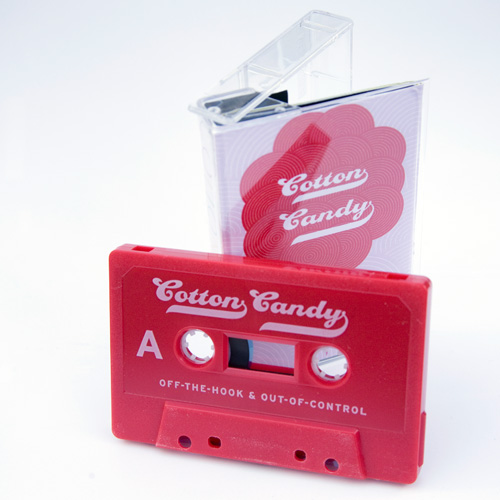 High fidelity chrome cassette with opaque white ink print on opaque red plastic shell.